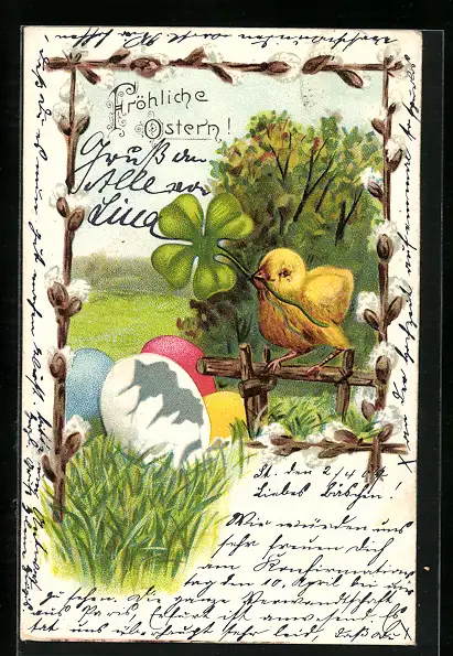 AK Fröhliche Ostern!, Osterküken mit Klee