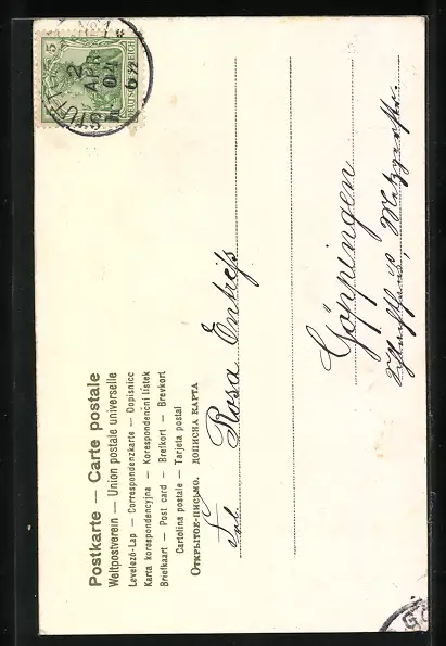 Personenbezogene Daten auf der Rückseite der Karte wurden durch blauen Textmarker unkenntlich gemacht. Die blauen Stellen sind auf die Vorderseite durchgeweicht und wirken sich negativ auf das Postkartenfoto aus
