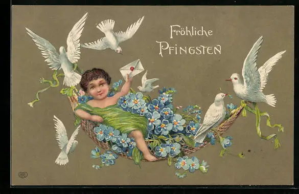 AK Fröhliche Pfingsten, Kind mit Vergissmeinnicht und Tauben