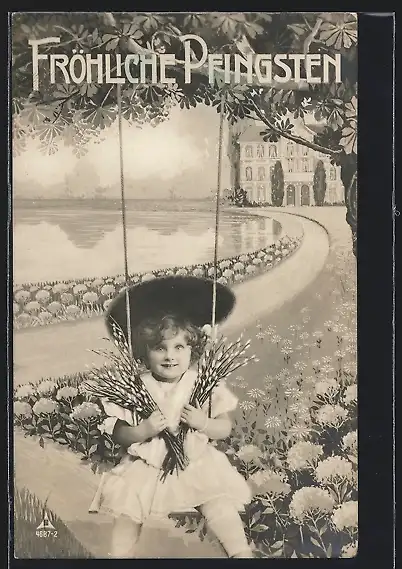 AK Fröhliche Pfingsten - Mädchen mit Maikätzchen auf einer Schaukel