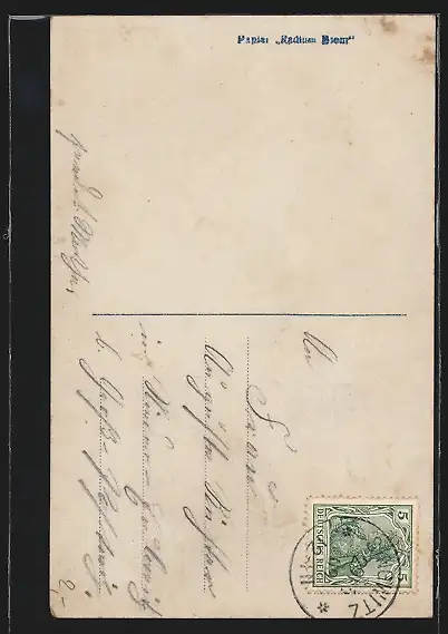 Personenbezogene Daten auf der Rückseite der Karte wurden durch blauen Textmarker unkenntlich gemacht. Die blauen Stellen sind auf die Vorderseite durchgeweicht und wirken sich negativ auf das Postkartenfoto aus