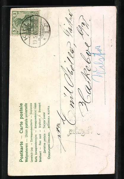 Personenbezogene Daten auf der Rückseite der Karte wurden durch blauen Textmarker unkenntlich gemacht. Die blauen Stellen sind auf die Vorderseite durchgeweicht und wirken sich negativ auf das Postkartenfoto aus