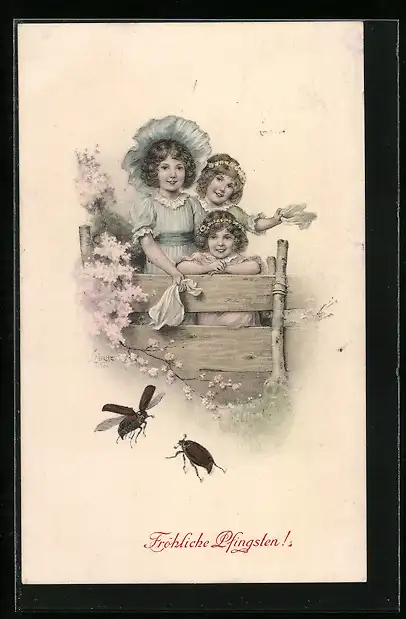AK Fröhliche Pfingsten, Maikäfer und winkende Kinder
