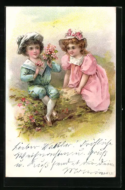 AK Fröhliche Pfingsten, Zwei Kinder sitzen auf einem Baumstamm