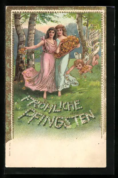 AK Fröhliche Pfingsten, Zwei hübsche Mädchen mit einem Korb voller Blüten