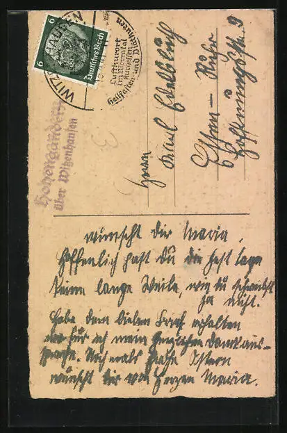Personenbezogene Daten auf der Rückseite der Karte wurden durch blauen Textmarker unkenntlich gemacht. Die blauen Stellen sind auf die Vorderseite durchgeweicht und wirken sich negativ auf das Postkartenfoto aus