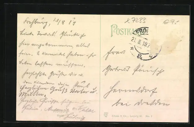 gelaufen 1919, Briefmarke entfernt, guter Zustand