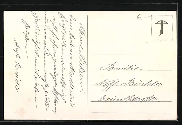 Personenbezogene Daten auf der Rückseite der Karte wurden durch blauen Textmarker unkenntlich gemacht. Die blauen Stellen sind auf die Vorderseite durchgeweicht und wirken sich negativ auf das Postkartenfoto aus