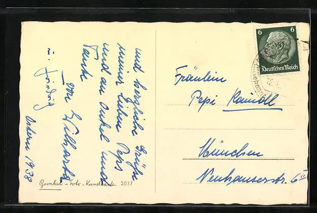 Personenbezogene Daten auf der Rückseite der Karte wurden durch blauen Textmarker unkenntlich gemacht. Die blauen Stellen sind auf die Vorderseite durchgeweicht und wirken sich negativ auf das Postkartenfoto aus