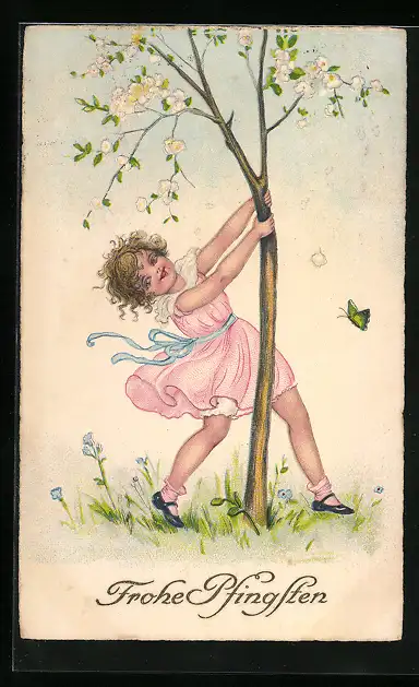 AK Frohe Pfingsten, Mädchen tanzt um einen Baum