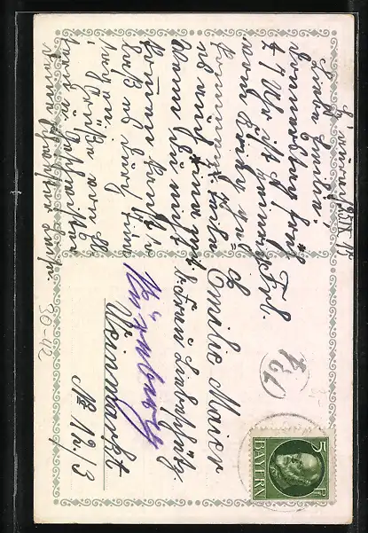 Personenbezogene Daten auf der Rückseite der Karte wurden durch blauen Textmarker unkenntlich gemacht. Die blauen Stellen sind auf die Vorderseite durchgeweicht und wirken sich negativ auf das Postkartenfoto aus