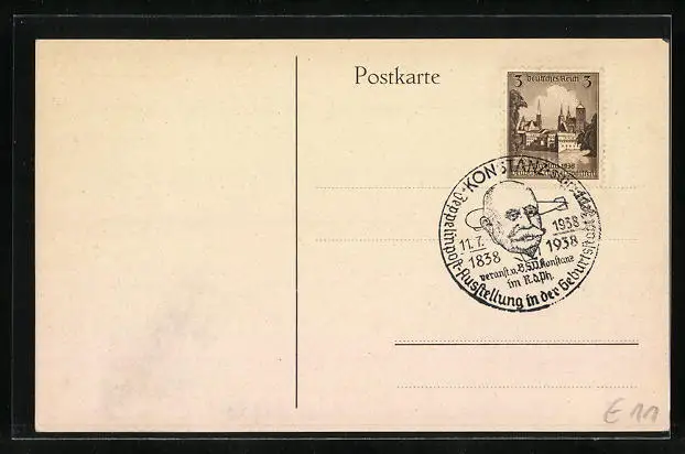 Personenbezogene Daten auf der Rückseite der Karte wurden durch blauen Textmarker unkenntlich gemacht. Die blauen Stellen sind auf die Vorderseite durchgeweicht und wirken sich negativ auf das Postkartenfoto aus