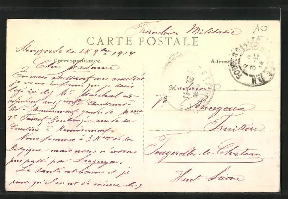 Personenbezogene Daten auf der Rückseite der Karte wurden durch blauen Textmarker unkenntlich gemacht. Die blauen Stellen sind auf die Vorderseite durchgeweicht und wirken sich negativ auf das Postkartenfoto aus