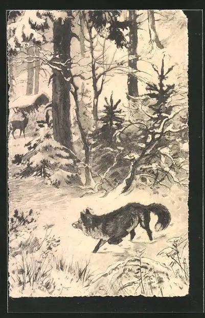 AK Fuchs auf Beutejagd im verschneiten Wald