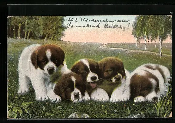 AK Fünf Bernhardiner-Welpen auf einer Wiese
