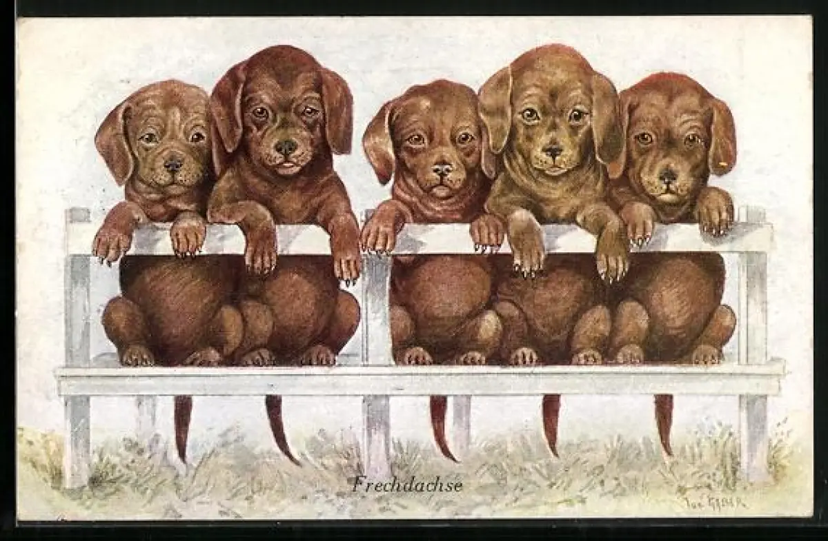 AK Fünf Hundewelpen auf einer Bank, Neujahrsgruss