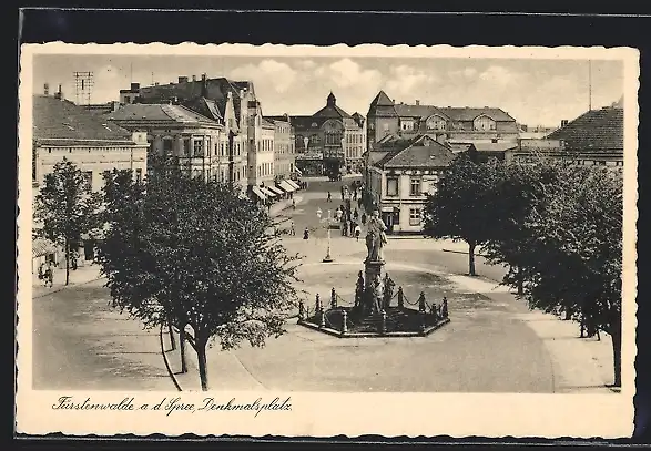 AK Fürstenwalde a.d. Spree, Denkmalsplatz mit Geschäften