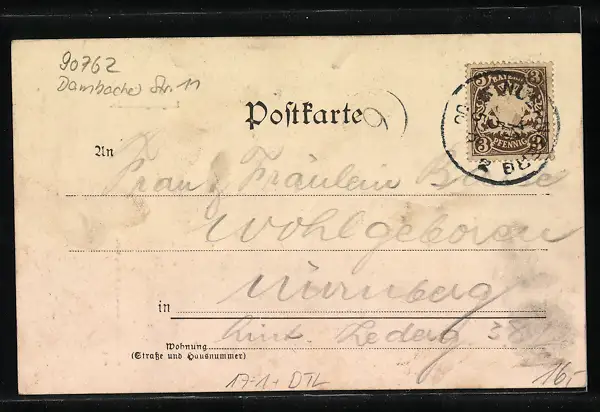 Personenbezogene Daten auf der Rückseite der Karte wurden durch blauen Textmarker unkenntlich gemacht. Die blauen Stellen sind auf die Vorderseite durchgeweicht und wirken sich negativ auf das Postkartenfoto aus