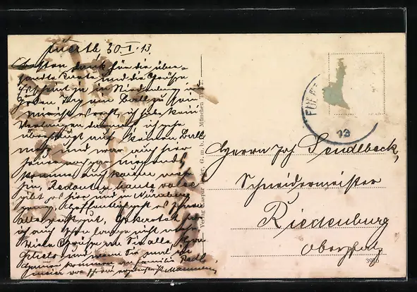 alte Ansichtskarte, gelaufen, Briefmarke entfernt, rückseitig Oberflächenschaden, guter Zustand