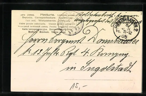 alte Ansichtskarte, gelaufen 1905, Stempelspur, guter Zustand