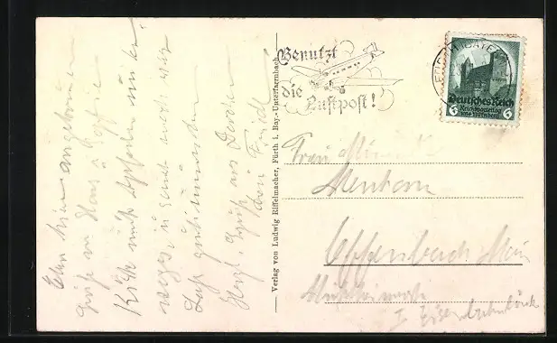 Personenbezogene Daten auf der Rückseite der Karte wurden durch blauen Textmarker unkenntlich gemacht. Die blauen Stellen sind auf die Vorderseite durchgeweicht und wirken sich negativ auf das Postkartenfoto aus