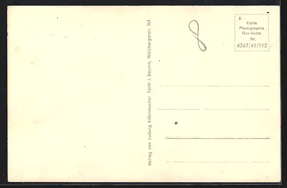 Personenbezogene Daten auf der Rückseite der Karte wurden durch blauen Textmarker unkenntlich gemacht. Die blauen Stellen sind auf die Vorderseite durchgeweicht und wirken sich negativ auf das Postkartenfoto aus