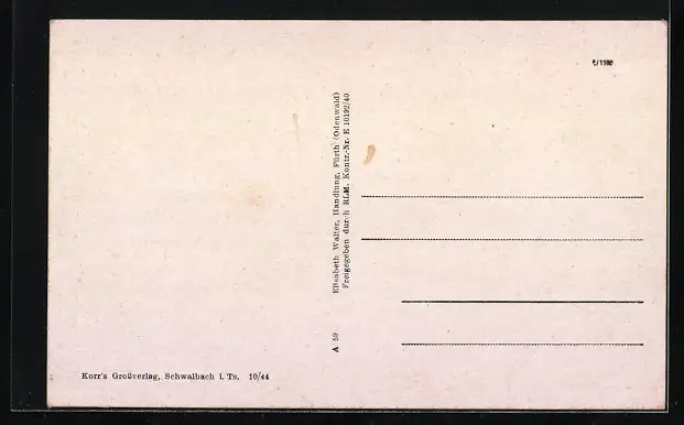 Personenbezogene Daten auf der Rückseite der Karte wurden durch blauen Textmarker unkenntlich gemacht. Die blauen Stellen sind auf die Vorderseite durchgeweicht und wirken sich negativ auf das Postkartenfoto aus