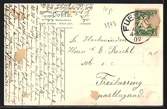 gelaufen 1907, rückseitig Klebe- und Papierreste, Eckknick unten li., guter Zustand