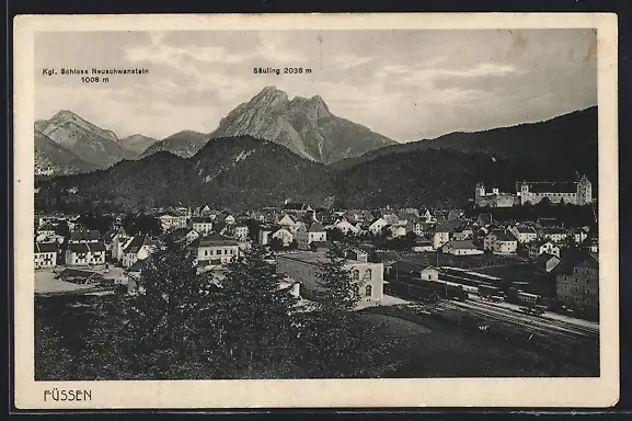 AK Füssen, Ortsansicht mit Bahnhof und Säuling
