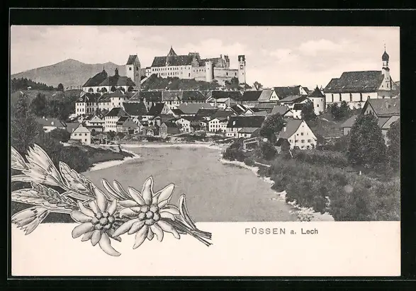 AK Füssen a. Lech, Ortsansicht und Flusspartie, Edelweiss