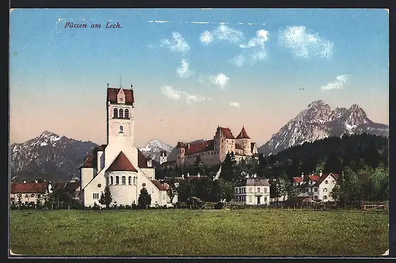 AK Füssen am Lech, Ortsansicht mit Bergpanorama