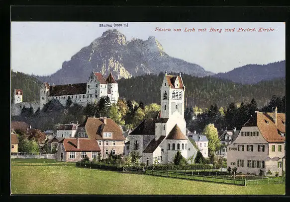 AK Füssen am Lech, Ortspartie mit Burg und Protest. Kirche