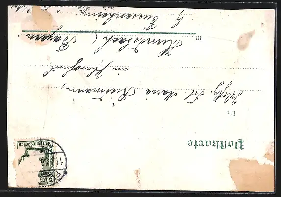 gelaufen 1910, Briefmarke entfernt, rückseitig Klebe- und Papierreste, rückseitig Oberflächenschaden, obere u. linke u. rechte Kante beschnitten