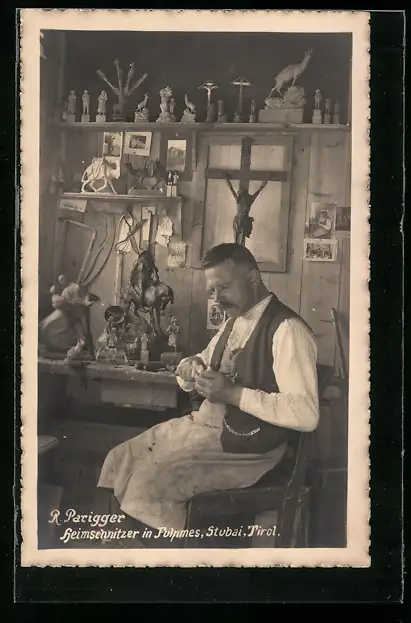 AK Fulpmes, Heimschnitzer R. Parigger in seiner Werkstatt