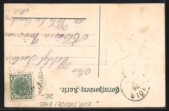 Personenbezogene Daten auf der Rückseite der Karte wurden durch blauen Textmarker unkenntlich gemacht. Die blauen Stellen sind auf die Vorderseite durchgeweicht und wirken sich negativ auf das Postkartenfoto aus