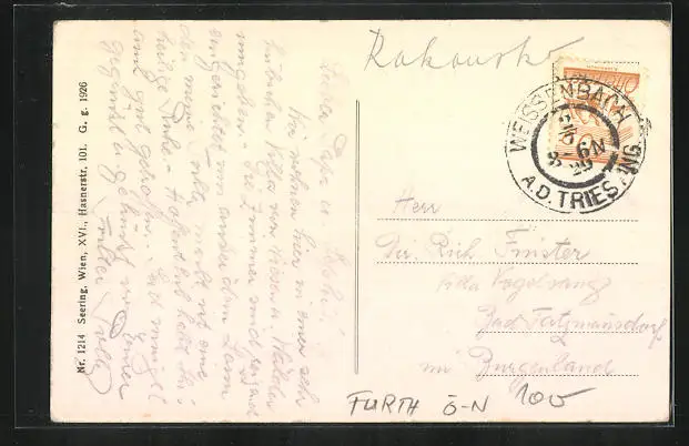 alte Ansichtskarte, gelaufen, Eckknicke re. oben u. li., Stempelspur, minimaler Einriss re. oben, guter Zustand