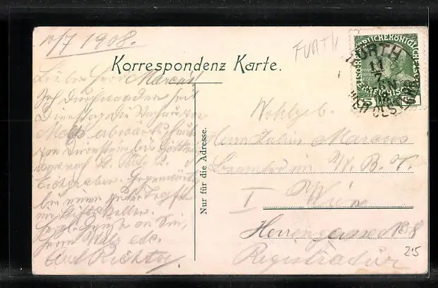 gelaufen 1908, Eckknicke re. oben u. li., Stempelspur, guter Zustand