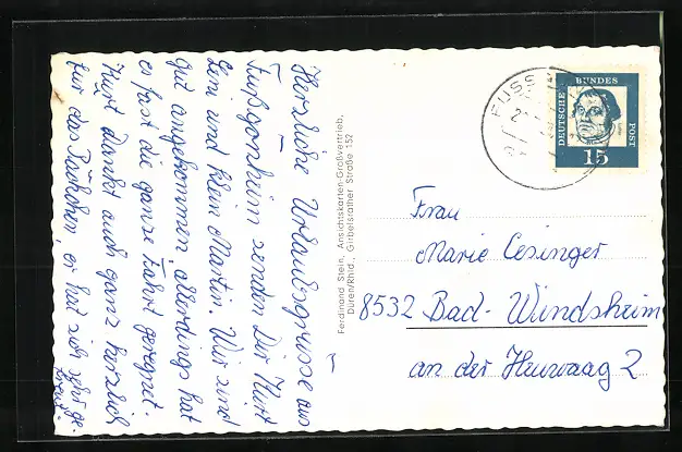 Personenbezogene Daten auf der Rückseite der Karte wurden durch blauen Textmarker unkenntlich gemacht. Die blauen Stellen sind auf die Vorderseite durchgeweicht und wirken sich negativ auf das Postkartenfoto aus