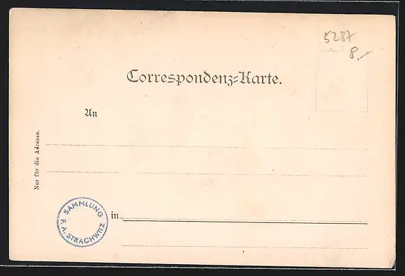 Personenbezogene Daten auf der Rückseite der Karte wurden durch blauen Textmarker unkenntlich gemacht. Die blauen Stellen sind auf die Vorderseite durchgeweicht und wirken sich negativ auf das Postkartenfoto aus