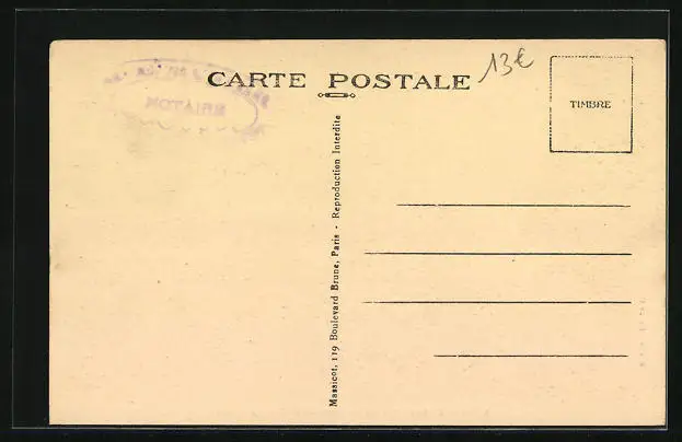 Personenbezogene Daten auf der Rückseite der Karte wurden durch blauen Textmarker unkenntlich gemacht. Die blauen Stellen sind auf die Vorderseite durchgeweicht und wirken sich negativ auf das Postkartenfoto aus