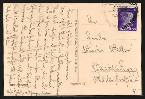 Personenbezogene Daten auf der Rückseite der Karte wurden durch blauen Textmarker unkenntlich gemacht. Die blauen Stellen sind auf die Vorderseite durchgeweicht und wirken sich negativ auf das Postkartenfoto aus