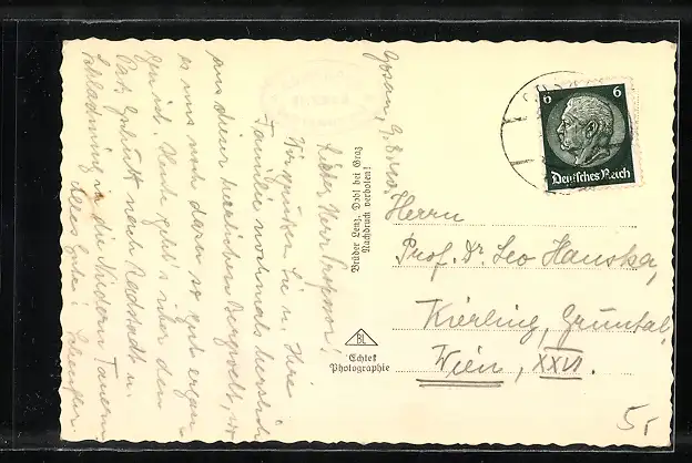 Personenbezogene Daten auf der Rückseite der Karte wurden durch blauen Textmarker unkenntlich gemacht. Die blauen Stellen sind auf die Vorderseite durchgeweicht und wirken sich negativ auf das Postkartenfoto aus