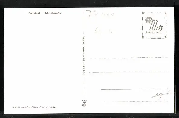 Personenbezogene Daten auf der Rückseite der Karte wurden durch blauen Textmarker unkenntlich gemacht. Die blauen Stellen sind auf die Vorderseite durchgeweicht und wirken sich negativ auf das Postkartenfoto aus