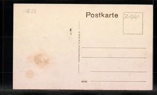 Personenbezogene Daten auf der Rückseite der Karte wurden durch blauen Textmarker unkenntlich gemacht. Die blauen Stellen sind auf die Vorderseite durchgeweicht und wirken sich negativ auf das Postkartenfoto aus