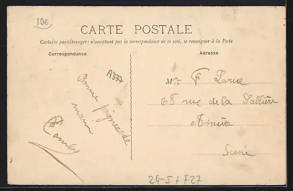 Personenbezogene Daten auf der Rückseite der Karte wurden durch blauen Textmarker unkenntlich gemacht. Die blauen Stellen sind auf die Vorderseite durchgeweicht und wirken sich negativ auf das Postkartenfoto aus