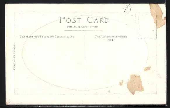 Personenbezogene Daten auf der Rückseite der Karte wurden durch blauen Textmarker unkenntlich gemacht. Die blauen Stellen sind auf die Vorderseite durchgeweicht und wirken sich negativ auf das Postkartenfoto aus