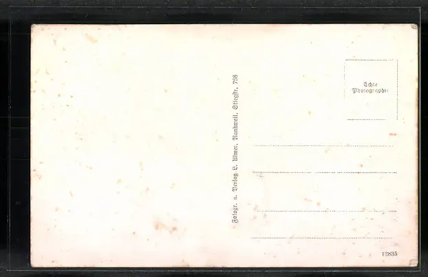Personenbezogene Daten auf der Rückseite der Karte wurden durch blauen Textmarker unkenntlich gemacht. Die blauen Stellen sind auf die Vorderseite durchgeweicht und wirken sich negativ auf das Postkartenfoto aus