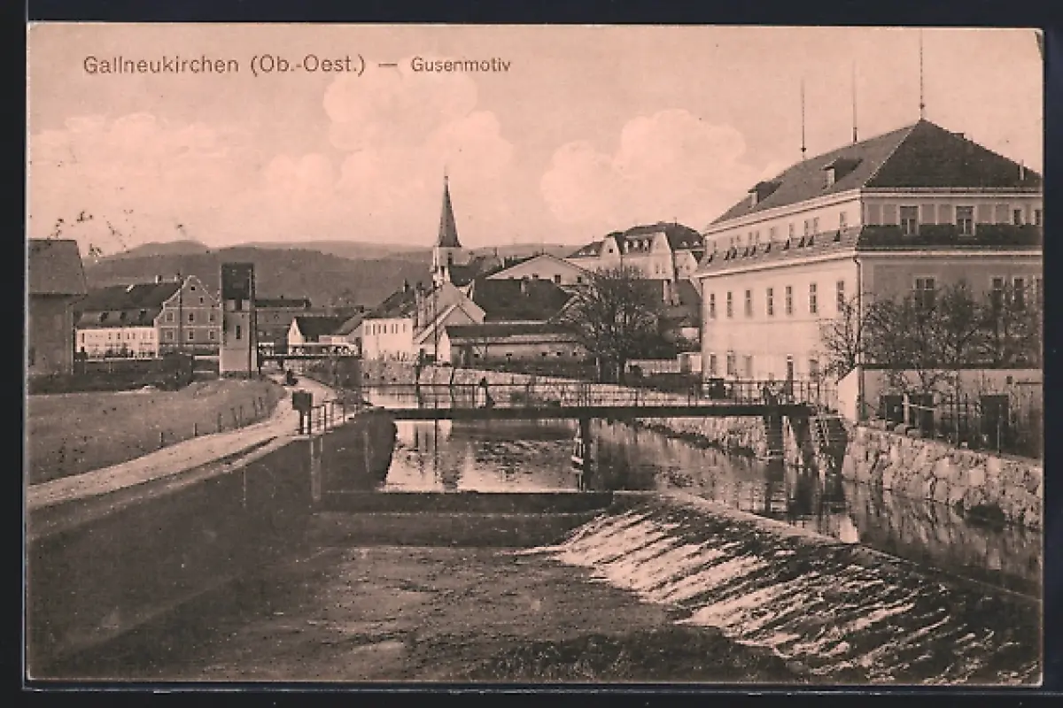 AK Gallneukirchen /O.-Ö., Gusenmotiv, Ortspanorama mit Brücke, Wehr u. Uferstrasse