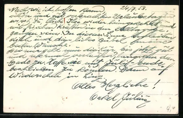 Personenbezogene Daten auf der Rückseite der Karte wurden durch blauen Textmarker unkenntlich gemacht. Die blauen Stellen sind auf die Vorderseite durchgeweicht und wirken sich negativ auf das Postkartenfoto aus