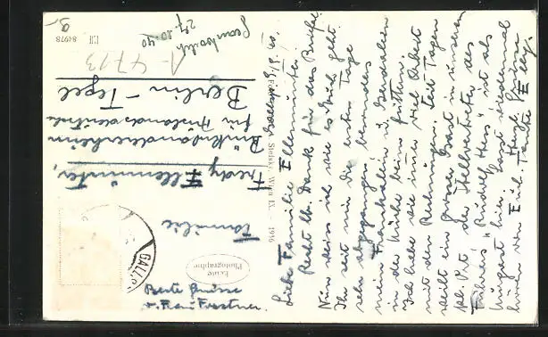 Personenbezogene Daten auf der Rückseite der Karte wurden durch blauen Textmarker unkenntlich gemacht. Die blauen Stellen sind auf die Vorderseite durchgeweicht und wirken sich negativ auf das Postkartenfoto aus